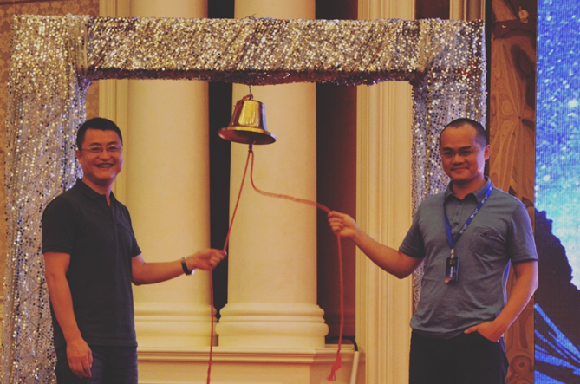 (图为王兴与干嘉伟共同为“互联网+大学”摇铃启幕)