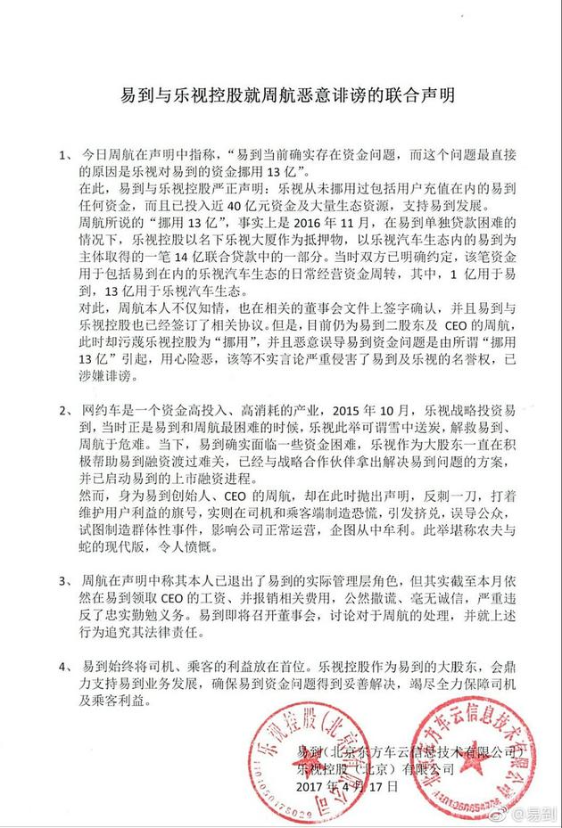 针对周航的声明,易到和乐视控股发表联合声明,表示乐视已投入近40亿元资金及大量生态资源,支持易到发展,并指责周航依然领取CEO的工资,引发挤兑误导公众。